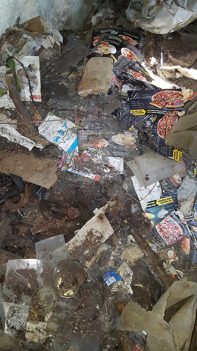 The first step was to clean out the rubbish. As you can see in the photos, the pillbox had acquired many layers of junk, including galvanized water tanks, barbed wire and pizza promotional leaflets. It was necessary to hire a skip to get rid of it all.