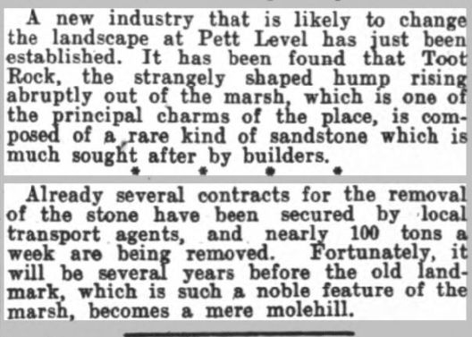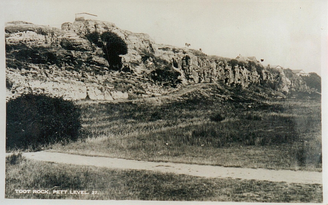 This 1920s image presents a good view of the Toot Rock cliff face. Much of Pett level is on low lying land; the Toot stands out quite clearly above this. 8,000 years ago the land was 40ft lower than it is today, moving on a few thousand years and the level had risen by 40ft with the area being covered by forest. At around 2,000 years ago the land was sinking again but this time the inhabitants were reclaiming it from the sea. This sheer cliff face of Ashdown sands shows that Toot Rock was eroded by tidal action. Looking at the surrounding flat land I wonder if the Toot would have once stood by itself as a small island in the sea.